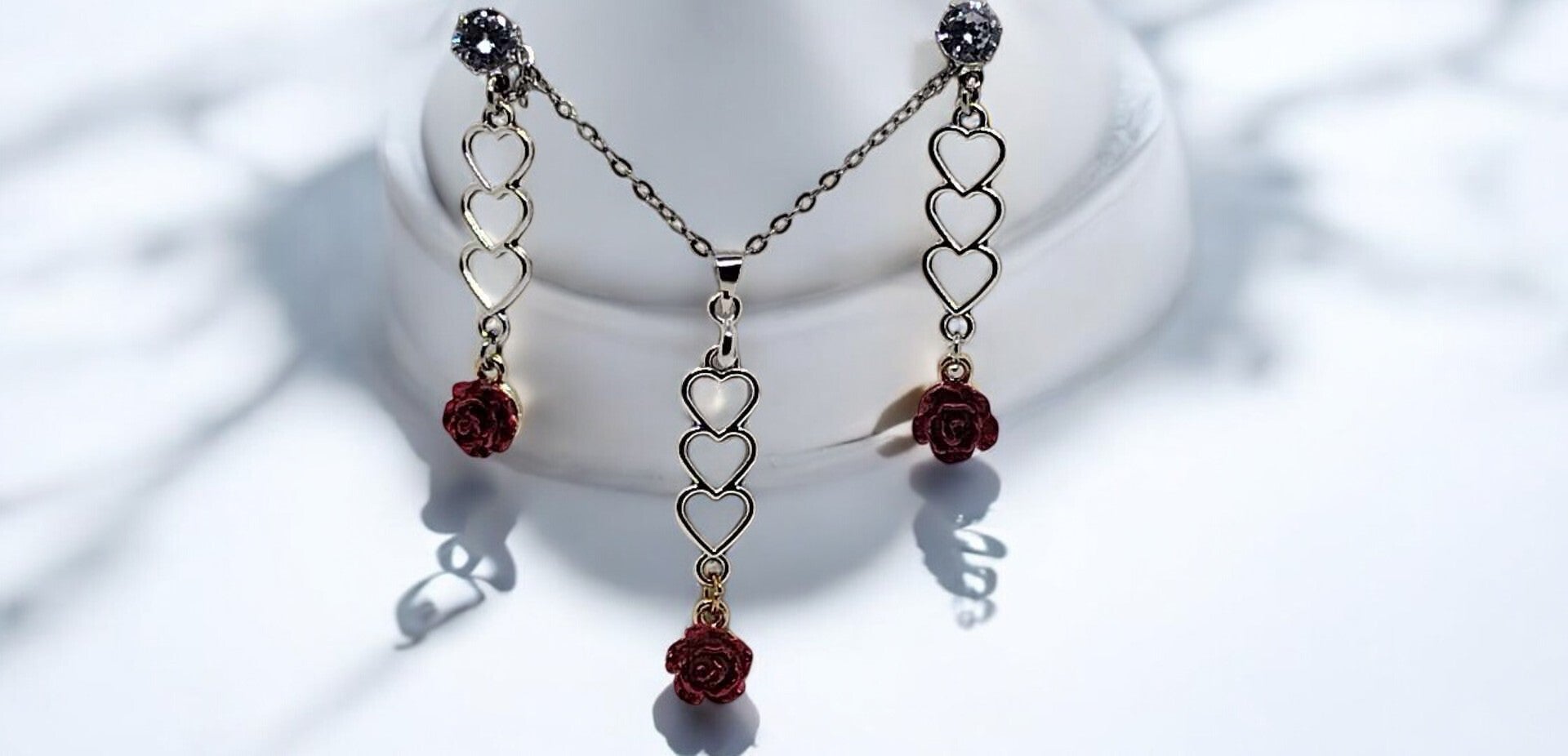 This triple hearts with red rose jewelry set is a perfect gift for someone special or a beautiful addition to your own collection, ideal for adding a touch of romance and elegance to any outfit.